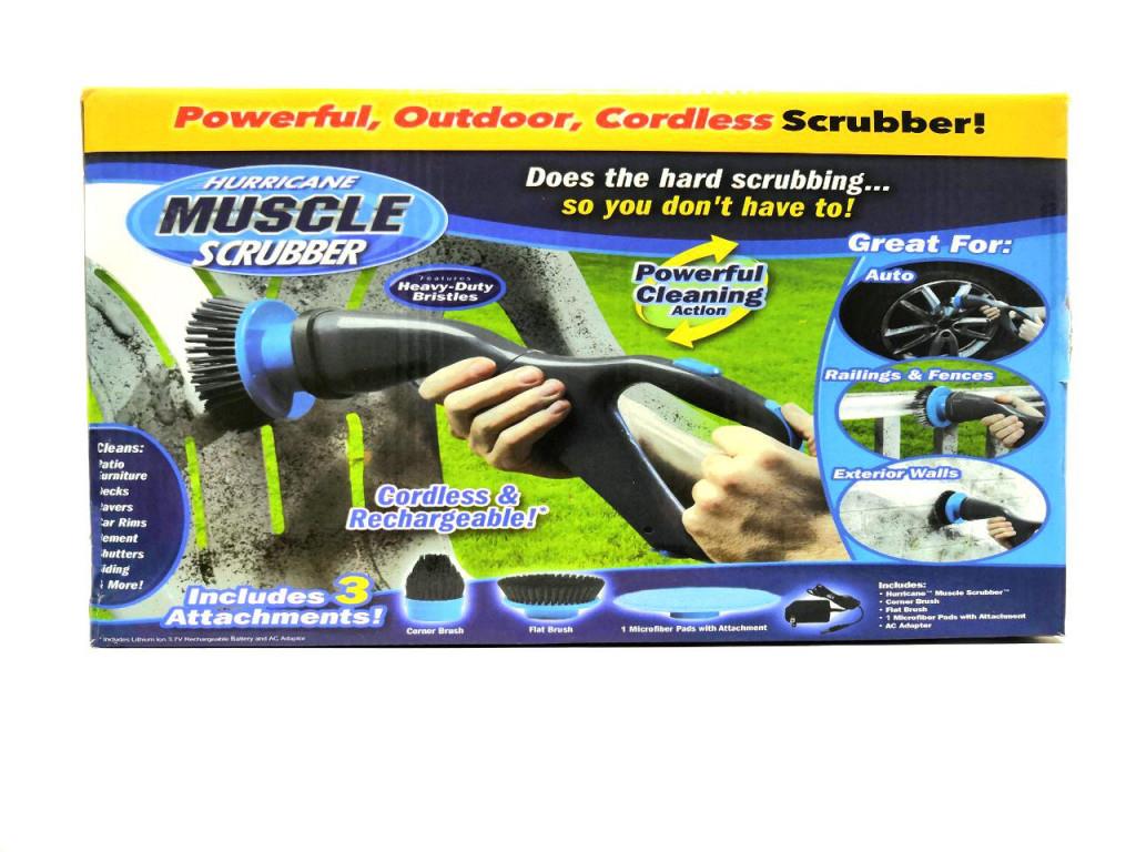 - Cleaning will cause stress. There’s got to be a better way. Introducing Hurricane Muscle Scrubber, the powerful cordless scrub brush designed to remove tough outdoor dirt and grime guaranteed.