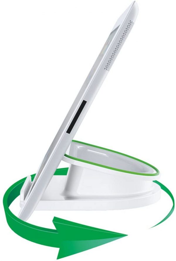 - White rotating desk stand with glossy finish for smartphones, iPads and tablet PCs, ideal for movies, hands free video conferencing and face-to-face presentations